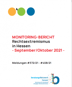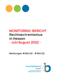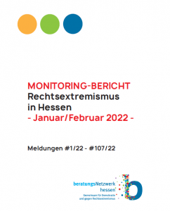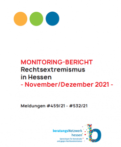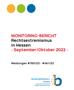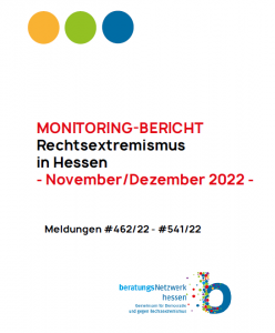 Unser Monitoringbericht zur „Rechtsextremismus in Hessen“ für November und Dezember 2022 ist erschienen. Wir erstellen kontinuierlich Monitoringbericht im Auftrag des Demokratiezentrums Hessen im „Beratungsnetzwerk Hessen – gemeinsam für Demokratie und gegen Rechtsextremismus“